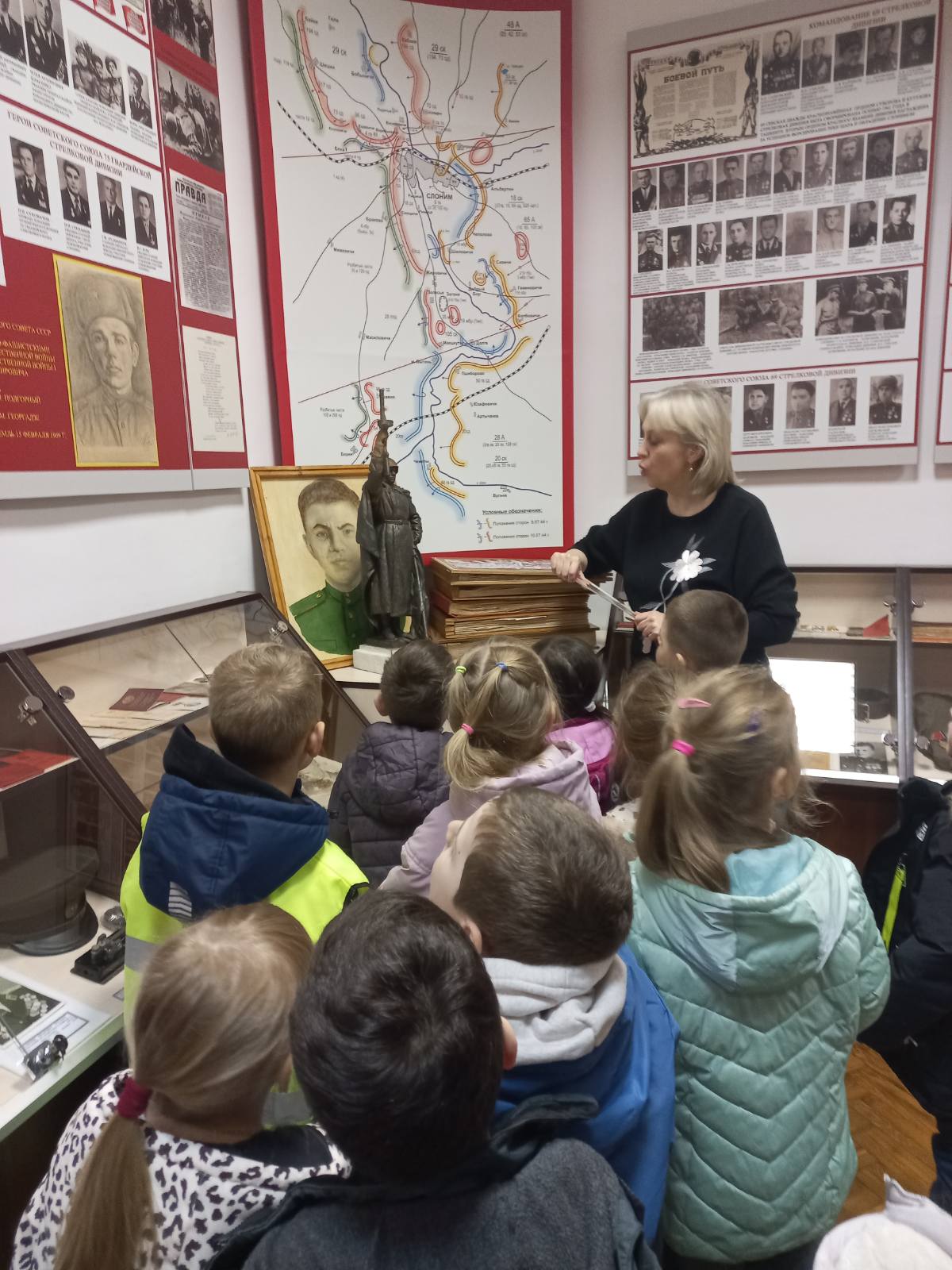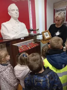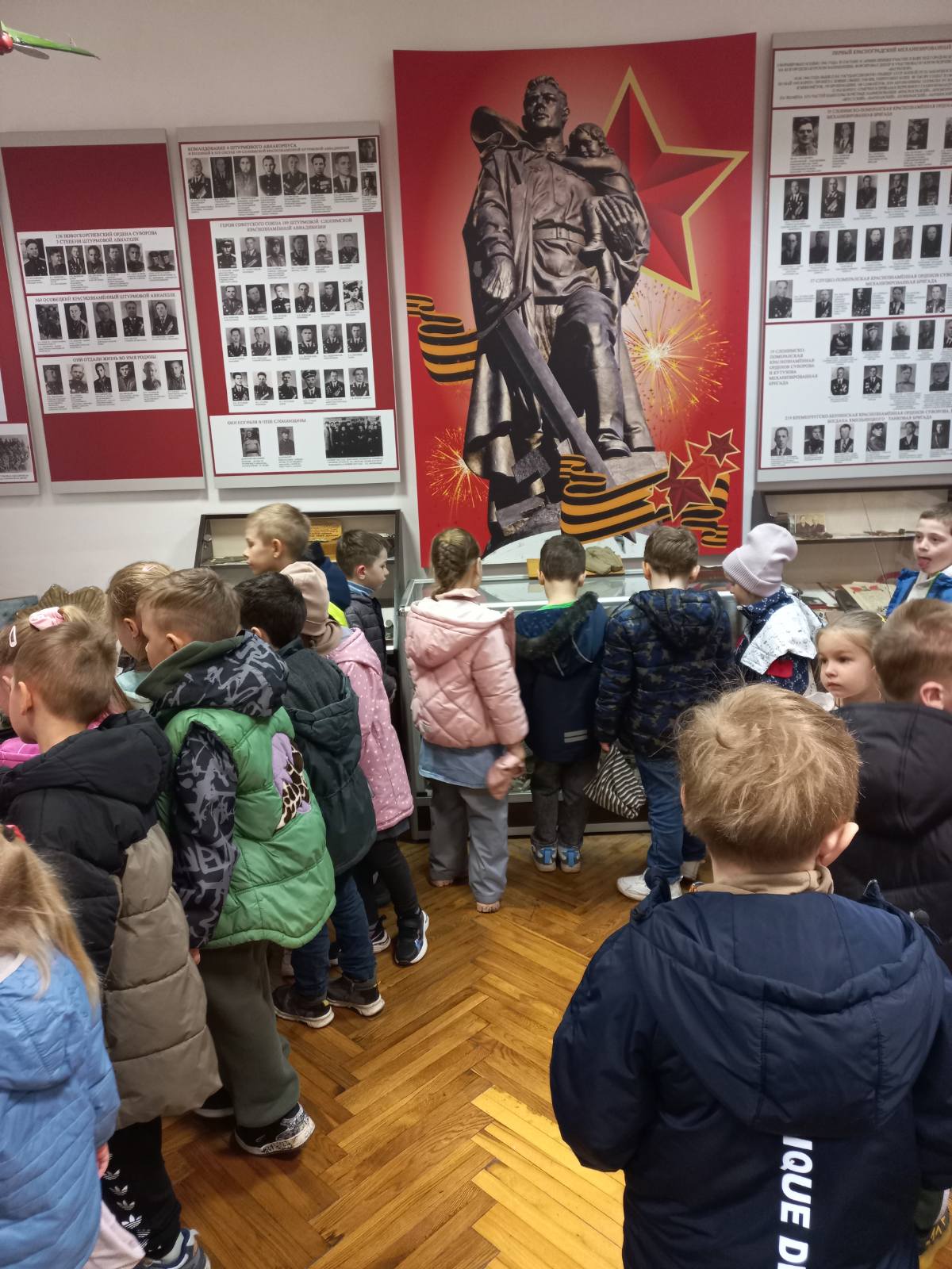 Воспитанники старшей и специальной группы посетили народный музей боевой и трудовой славы имени А.С.Жуковского, который находится в государственном учреждении образования "Средняя школа № 4 г.Слонима П.И.Батова". Ребята с интересом слушали экскурсовода и рассматривали экспонаты: оружие, военную форму, фотографии солдат, познакомились с историей нашего города, с людьми, которые его защищали.